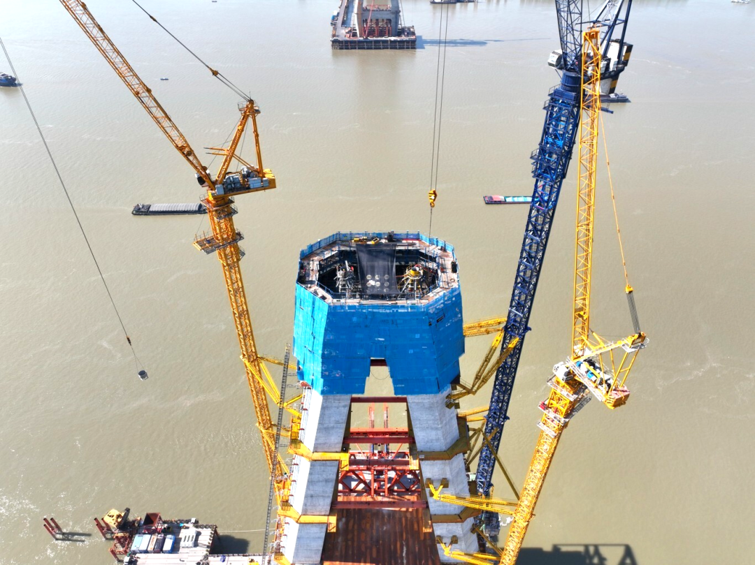 池州長江公鐵大橋是合肥至池州城際鐵路的全線控制性工程,全長3108.5米,其中跨江主橋長1768米,采用(100+378+812+364+114)米三主桁三索面雙層鋼桁梁斜拉橋;其中4號主塔為曲線優(yōu)美的鉆石型鋼筋混凝土結構,總高272.7米,由下、中、上塔柱三部分組成,共劃分為47個節(jié)段,逐級施工建成。