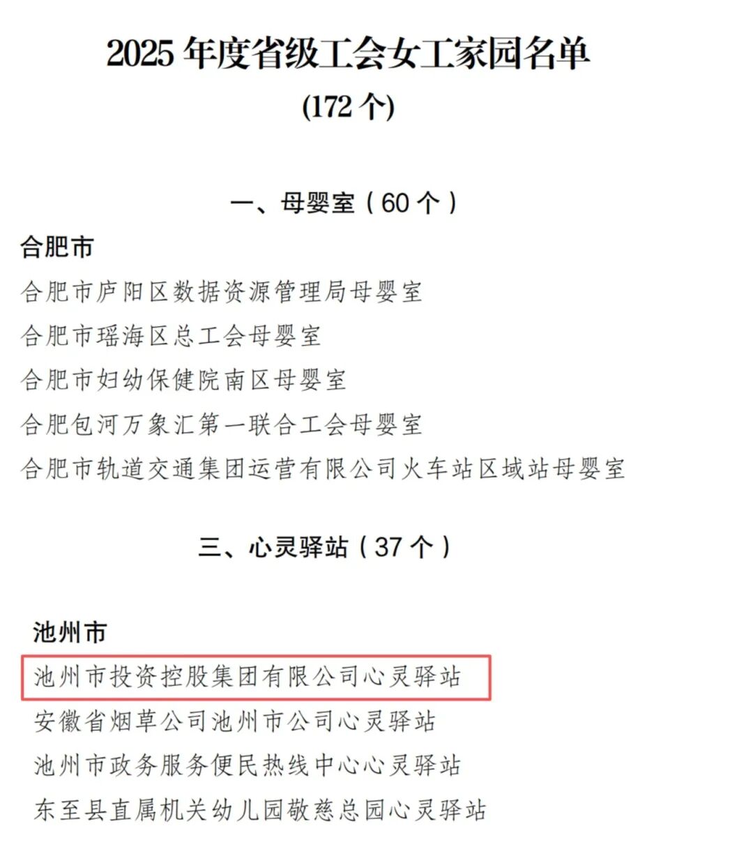 近日,安徽省總工會印發(fā)《關(guān)于公布2025年度省級工會女工家園名單的通知》,集團工會申報的省級工會女工家園心靈驛站項目順利通過評審,成功躋身省級女職工關(guān)愛服務(wù)陣地行列,這是集團工會深耕女職工權(quán)益保障、做實人文關(guān)懷工作的重要成果。