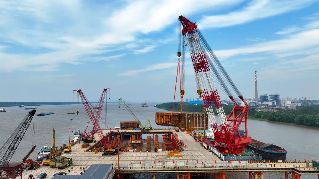 9月4日18時,在距離池州岸約400米的長江江面施工現(xiàn)場,隨著一艘1000噸級吊船平穩(wěn)地將底節(jié)最后一吊鋼圍堰準(zhǔn)確下放到位,標(biāo)志著中鐵大橋局承建的集團(tuán)“頭號工程”池州長江公鐵大橋南主塔墩(4號墩)大橋南主墩建設(shè)率先轉(zhuǎn)入圍堰施工階段。