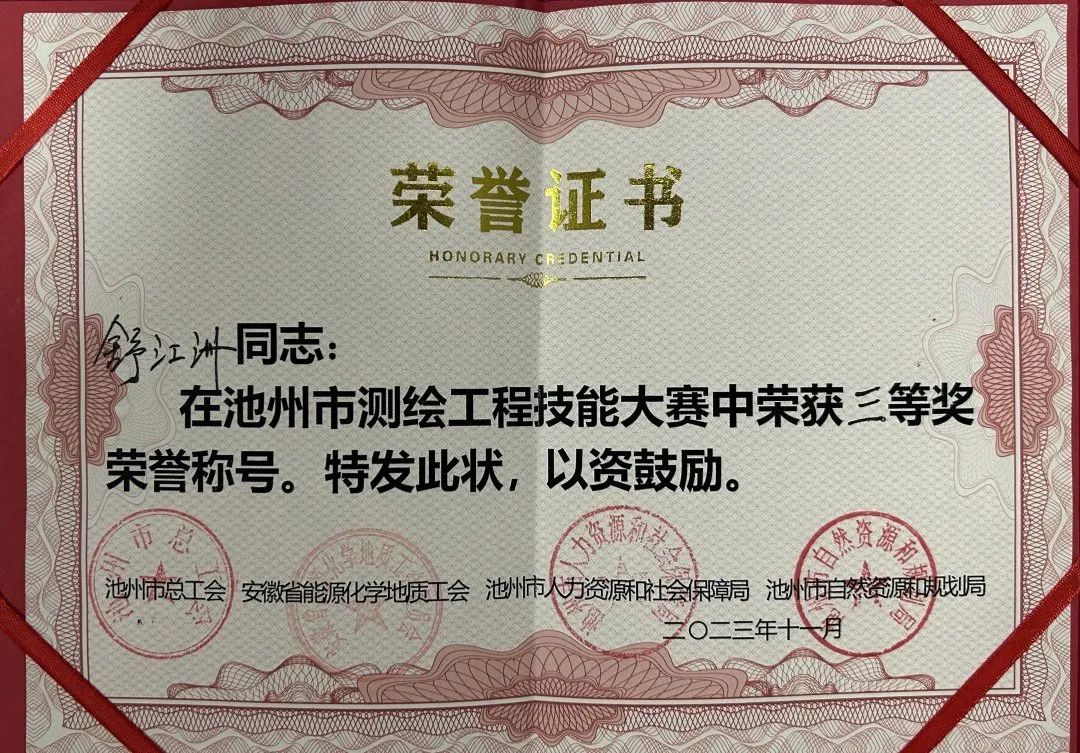 大賽設(shè)置了理論知識測試、團體技能操作和個人技能操作三個環(huán)節(jié)。設(shè)計總院5名職工參賽,參賽選手們先后完成了GNSS-RTK施工放樣、1:500數(shù)字地形圖測繪、四等水準(zhǔn)測量、測繪理論知識等多個項目,積極將所學(xué)理論知識轉(zhuǎn)化為實操技能,展現(xiàn)了良好的競技風(fēng)貌。經(jīng)過激烈地角逐,池州市規(guī)劃勘測設(shè)計總院有限公司榮獲團體一等獎,所屬測繪分院職工姜加喜和舒江洲兩位同志分別獲得個人賽一等獎和三等獎。