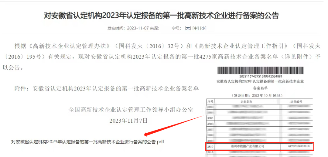 11月7日,全國高新技術(shù)企業(yè)認(rèn)定管理工作領(lǐng)導(dǎo)小組辦公室發(fā)布《對安徽省認(rèn)定機(jī)構(gòu)2023年認(rèn)定報備的第一批高新技術(shù)企業(yè)進(jìn)行備案的公告》,池州市數(shù)據(jù)產(chǎn)業(yè)有限公司名列其中,榮獲2023年度第一批認(rèn)定的高新技術(shù)企業(yè)。