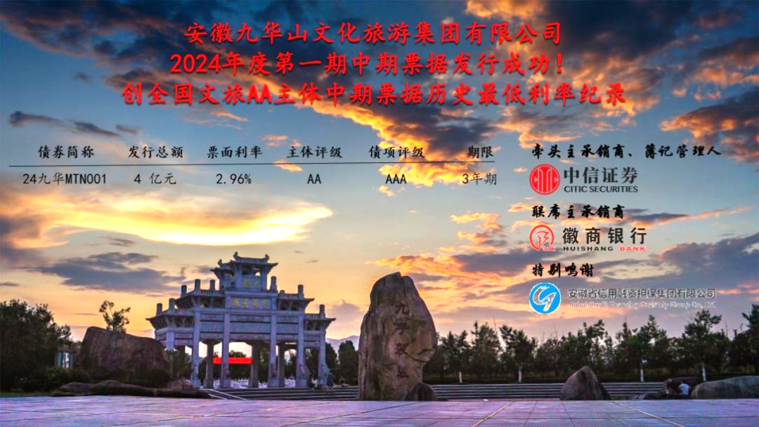 2024年1月26日,文旅集團2024年度第一期中期票據(jù)(24九華MTN001)成功發(fā)行。募集資金規(guī)模4億元,期限3年,票面利率2.96%,認購倍數(shù)4.9倍,創(chuàng)全國文旅AA主體中期票據(jù)歷史最低利率記錄!