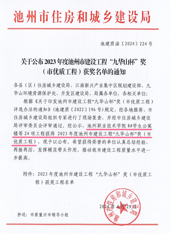近日,池州市住房和城鄉(xiāng)建設(shè)局印發(fā)了《關(guān)于公布2023年度池州市建設(shè)工程“九華山杯”獎(市優(yōu)質(zhì)工程)獲獎名單的通知》(池建質(zhì)函〔2024〕224號),由池州建投集團(tuán)承建的池州職業(yè)技術(shù)學(xué)院8#學(xué)生公寓樓項目喜獲2023年度池州市建設(shè)工程“九華山杯”(市優(yōu)質(zhì)工程)獎。